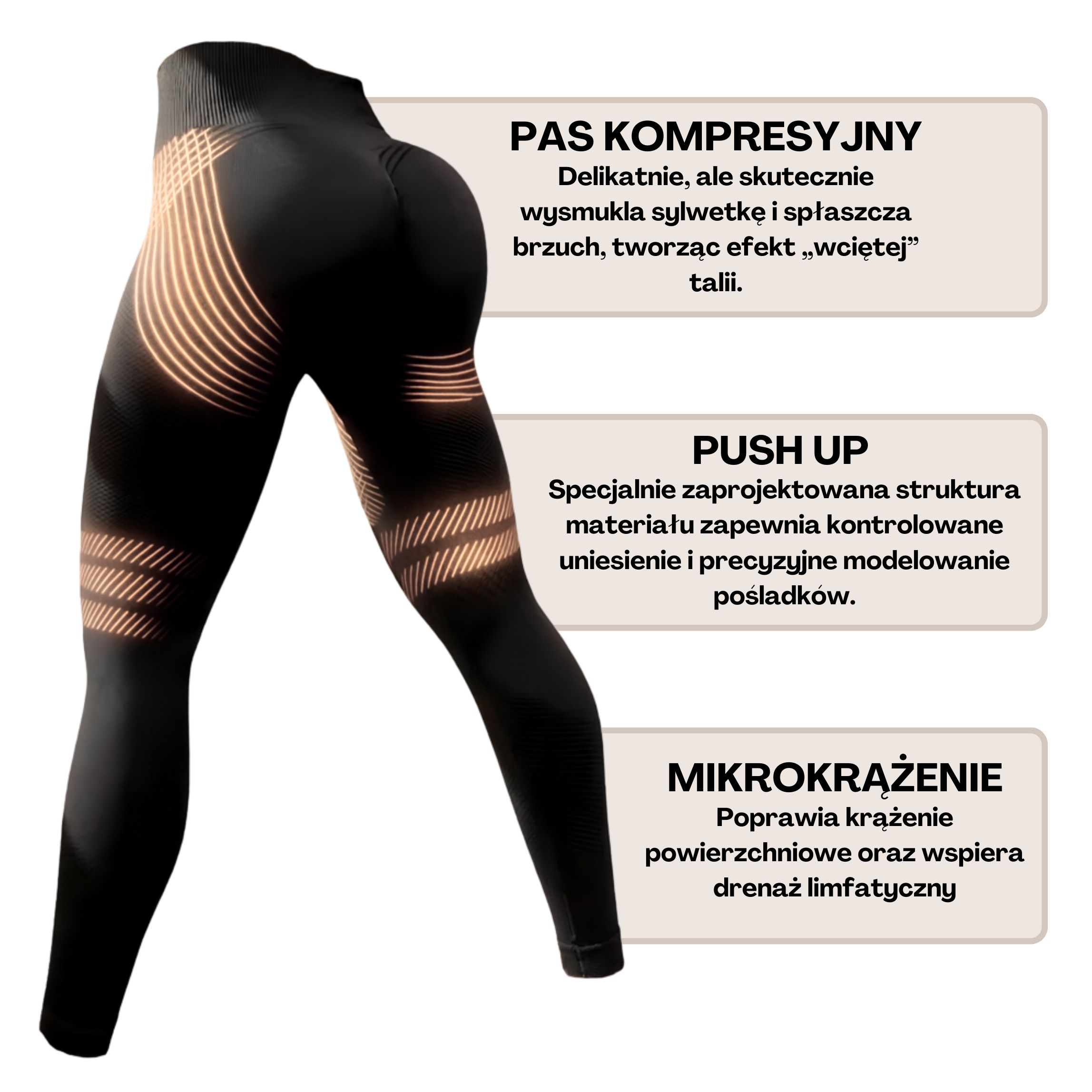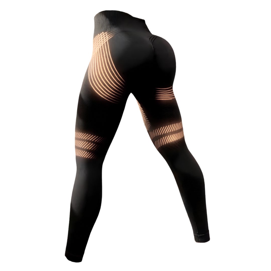 Legginsy działają dzięki połączeniu mikromasażu i kompresji, które pobudzają krążenie krwi i limfy.